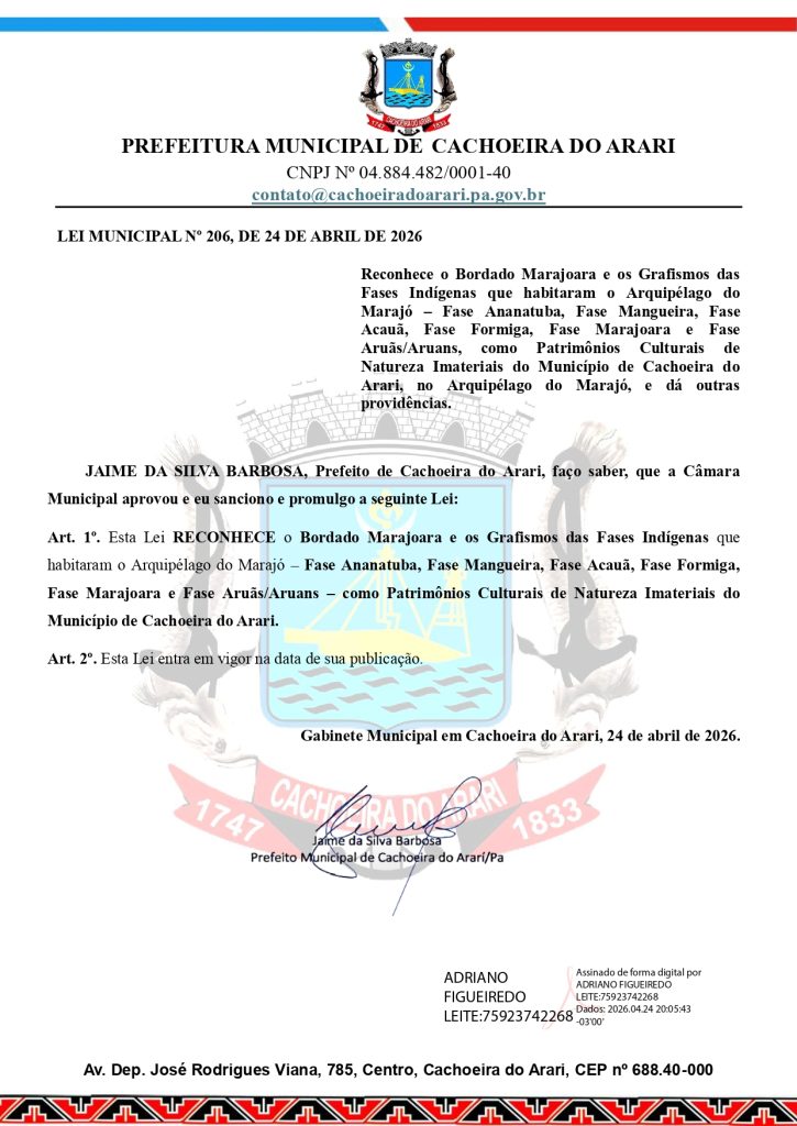 A Lei Municipal N⁰ 206/2026, de 24 de abril de 2026, que RECONHECE O BORDADO MARAJOARA E OS GRAFISMOS DAS DIFERENTES FASES INDÍGENAS QUE HABITARAM O ARQUIPÉLAGO DO MARAJÓ (Fase Ananatuba, Fase Mangueira, Fase Acauã, Fase Marajoara e Fase Aruã) COMO PATRIMÔNIOS CULTURAIS DE NATUREZA IMATERIAIS do município de Cachoeira do Arari.