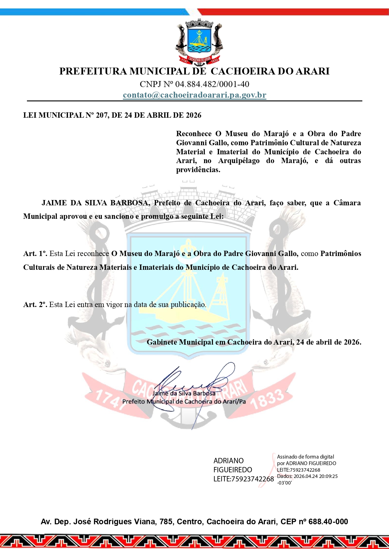 E, a Lei Municipal N⁰ 207/2026, de 24 de abril de 2026, que RECONHECE O MUSEU DO MARAJÓ E A OBRA DO PADRE GIOVANNI GALLO COMO PATRIMÔNIO CULTURAL DE NATUREZA MATERIAL E IMATERIAL do município de Cachoeira do Arari.